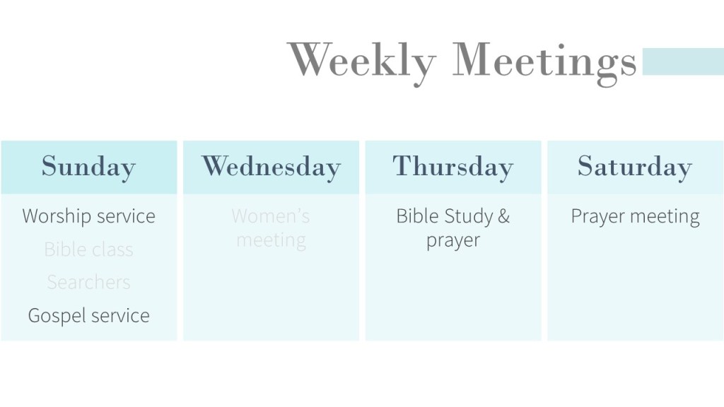 We have a variety of meetings for different purposes. We cordially invite you to join with us for fellowship in the name of our Lord Jesus Christ.