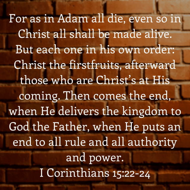 1 Corinthians 15:22-24 Posted bysladeevangelicalchurchAug 10, 2022Posted inBible verses Share this: Click to share on X (Opens in new window) X Click to share on Facebook (Opens in new window) Facebook Like Loading... Related